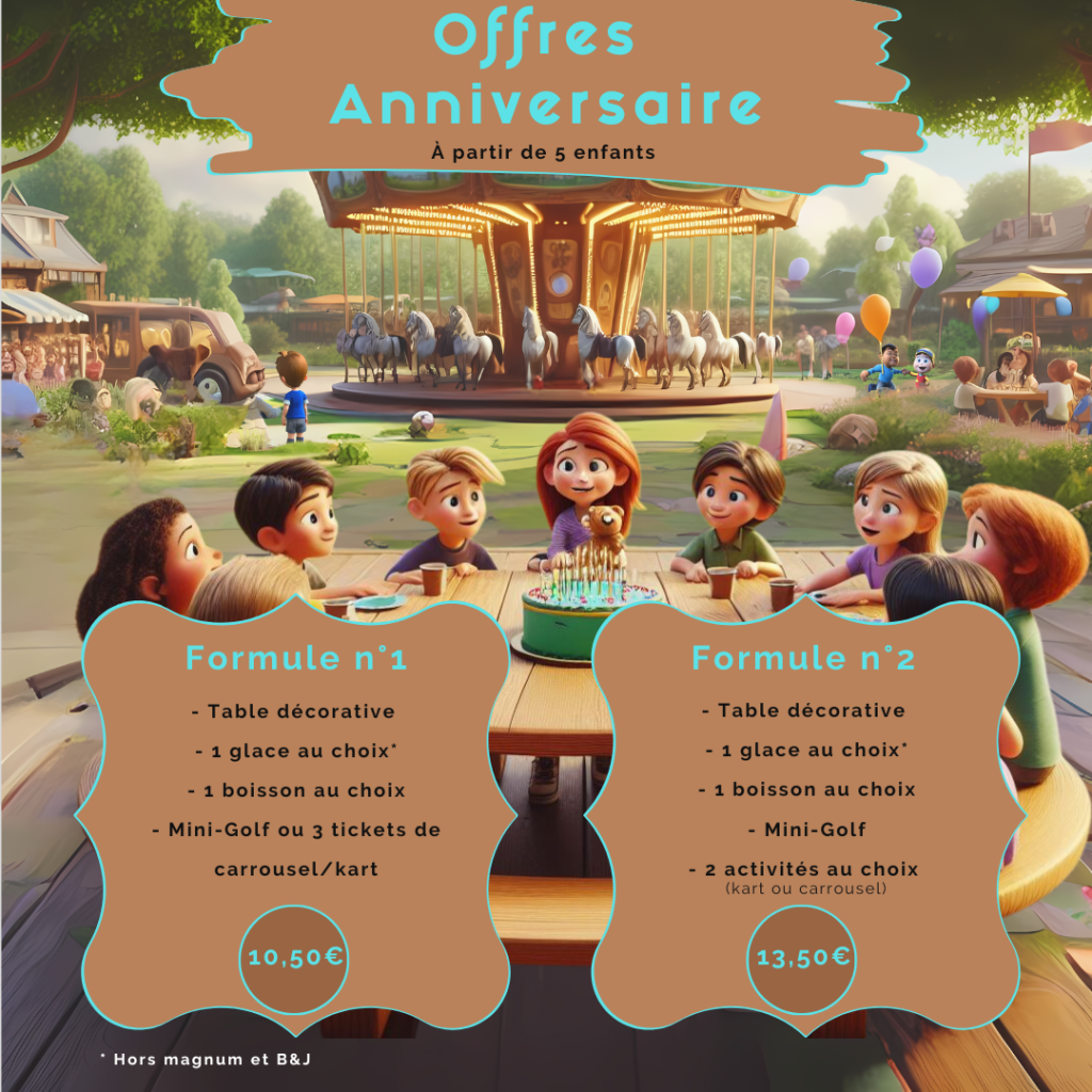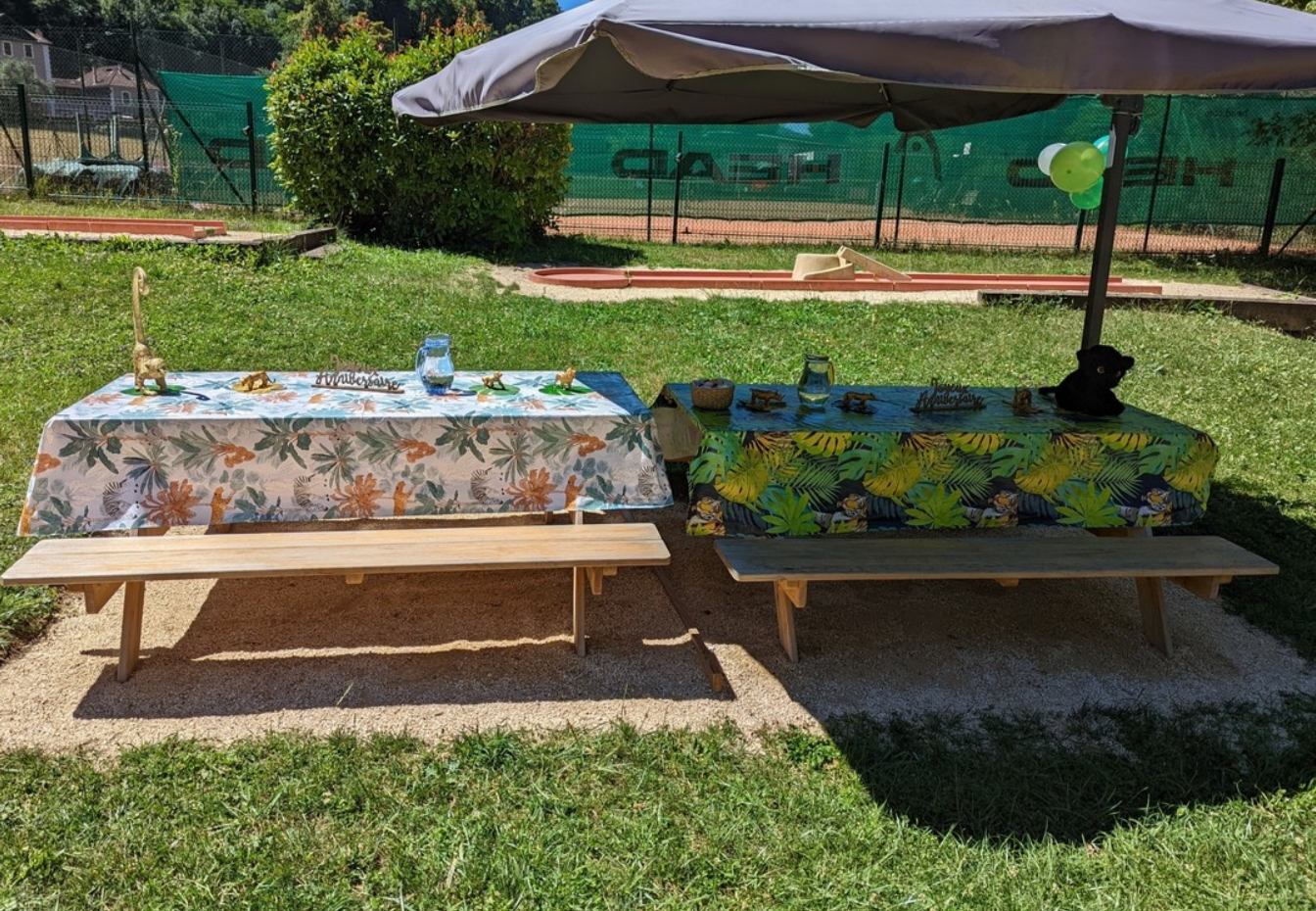đ Nos formules comprennent la rĂ©servation de deux grandes tables dĂ©corĂ©es, situĂ©es au sein du mini-golf, pour accueillir les enfants dans un cadre agrĂ©able, ombragĂ© et festif.